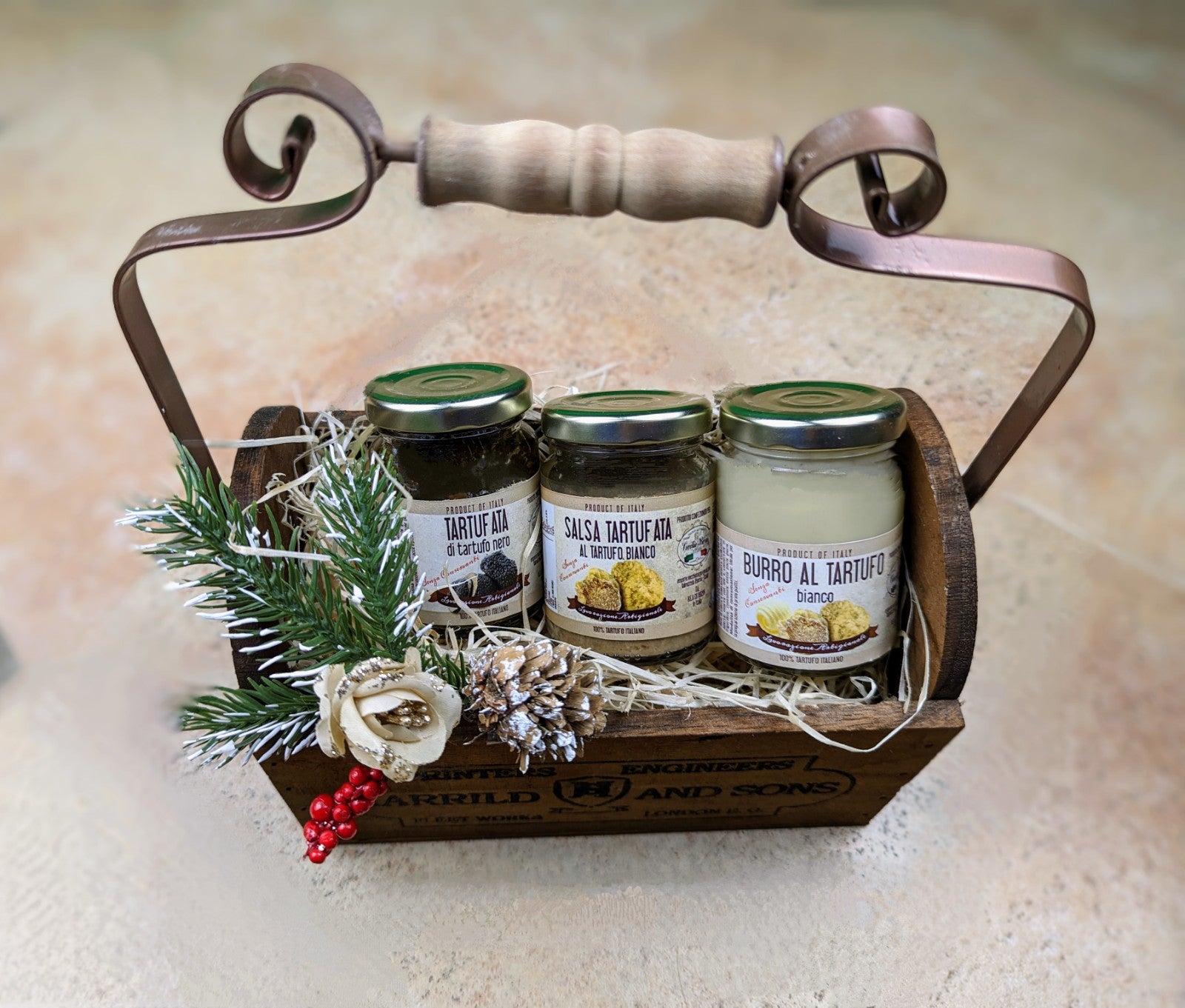 Caja regalo en cesta vintage de madera con asa original, reutilizable como quieras, decorada a mano!